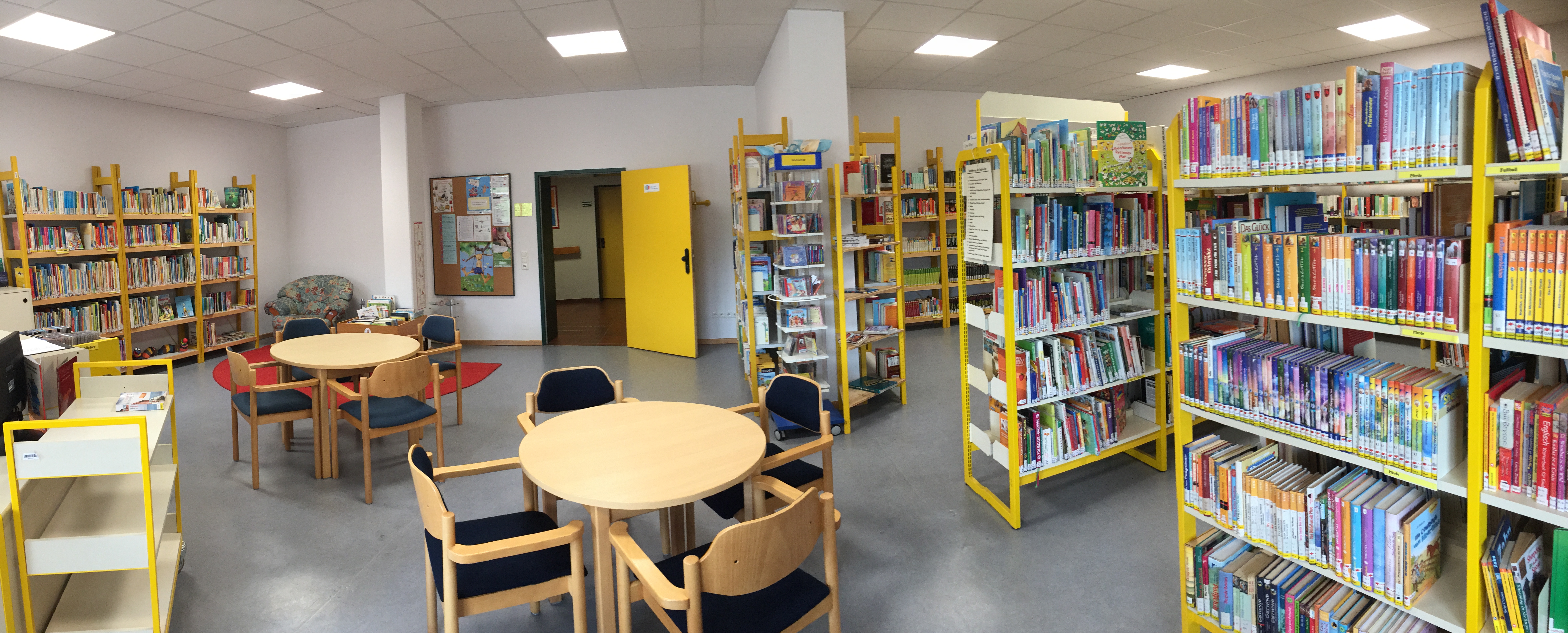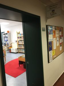 • Die neuen Räumlichkeiten der Bücherei sind durch den Haupteingang der Schule zu erreichen. Der Weg dorthin ist im Gebäude gekennzeichnet.