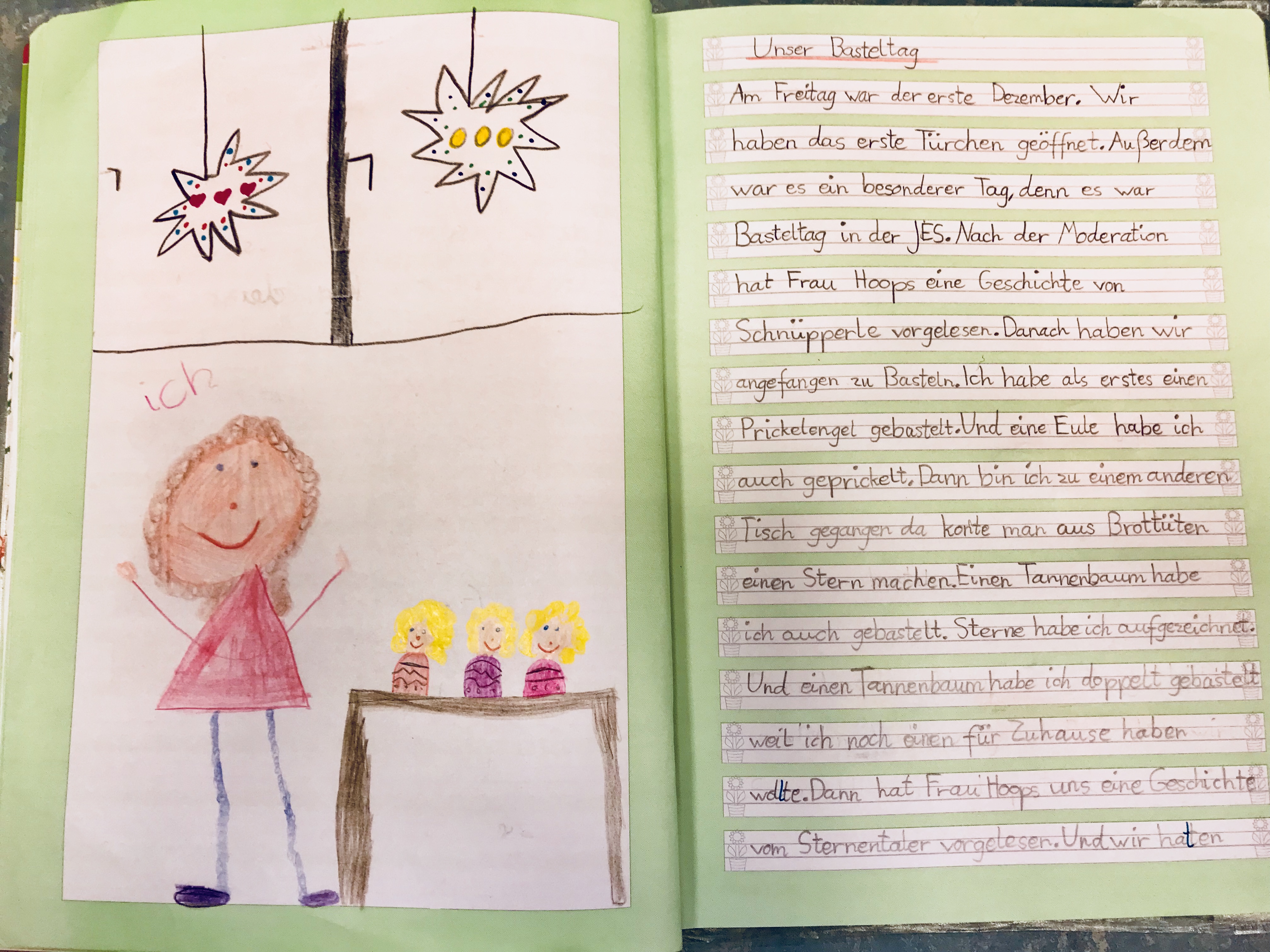 Am Freitag war der erste Dezember. Wir haben das erste Türchen geöffnet. Außerdem war es ein besonderer Tag, denn es war Basteltag in der JES. Wir sind ganz normal mit der Moderation gestartet. Danach waren wir im Sitzkreis und haben eine Geschichte von Frau Hoops gehört. Danach haben wir mit einigen Muttis gebastelt. Meine Mama und meine Schwester Änya waren auch da. Meine Mama hat mit uns Engel gemacht. Wir haben den ganzen Klassenraum geschmückt und den Flur und die Tannenbäume. Es gab sogar von meiner Mama Waffeln. Es hat allen Spaß gemacht.